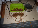 前足で器のヘリをペコンっとひっかけて、餌をばらまくことです。